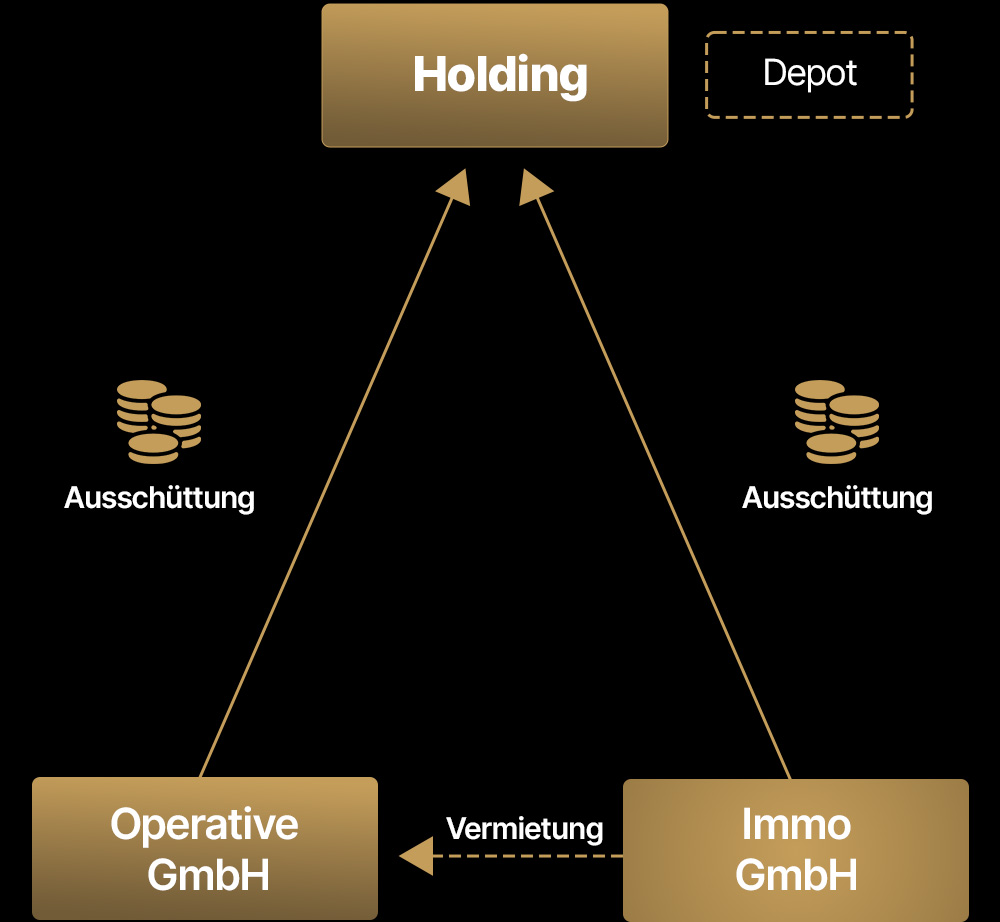Das heißt, du hast eine Holding-GmbH „über“ einer oder mehreren operativen GmbHs, über die du deine Dienstleistung erbringst und aktiv Geld verdienst.